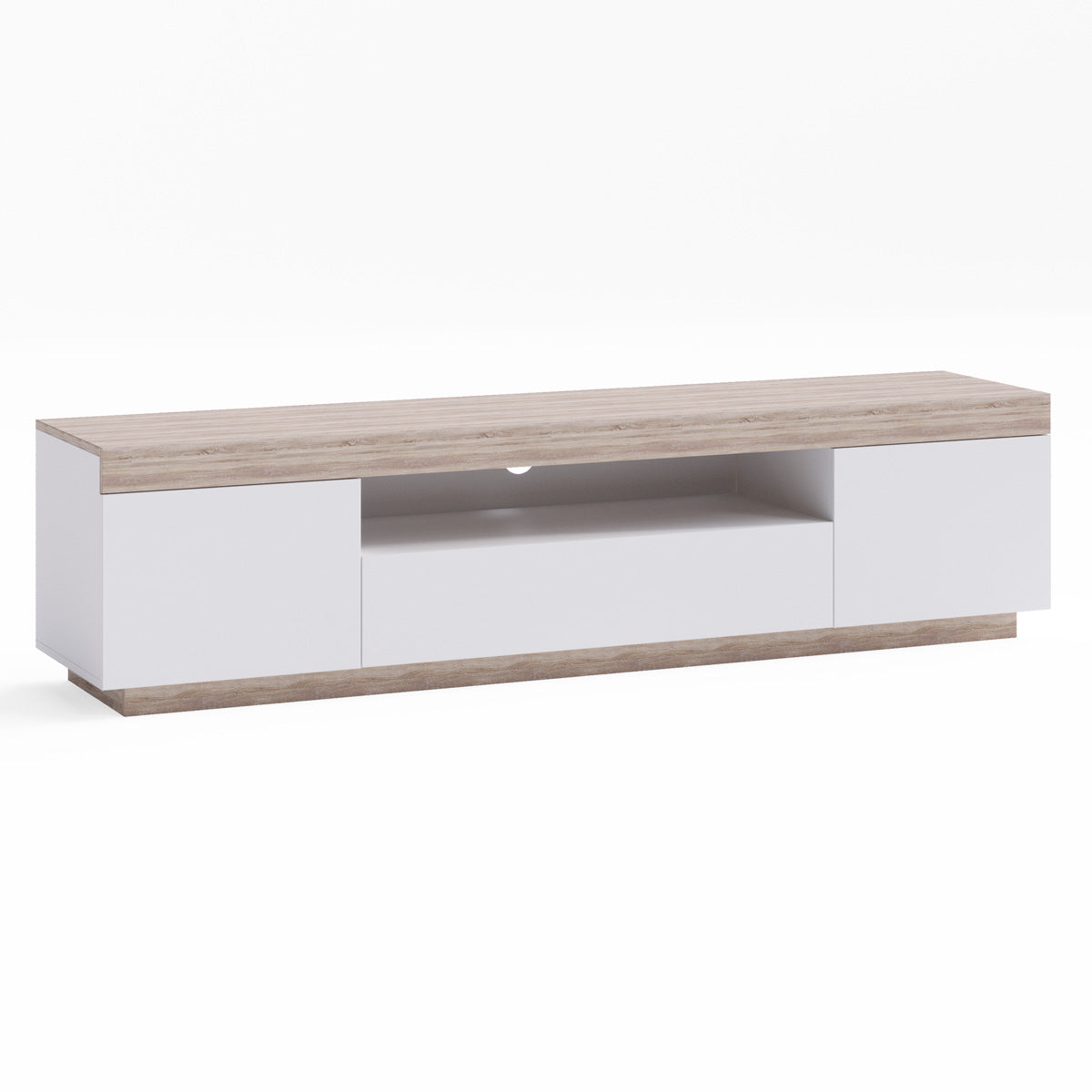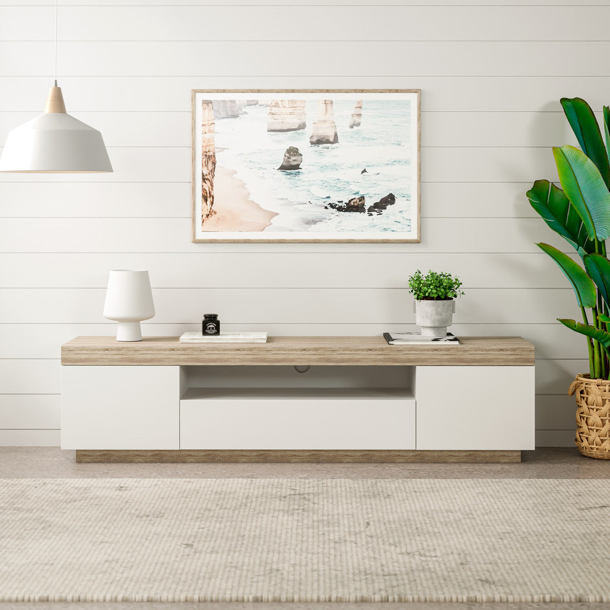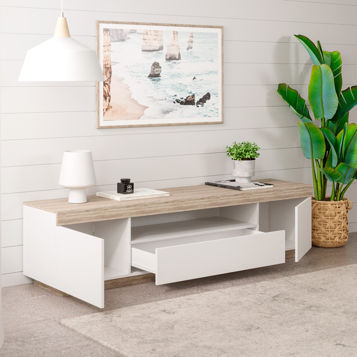Featuring a beautiful combination of natural oak colour and a crisp white cabinet body, this TV unit brings a coastal charm and timeless elegance to any home interior.