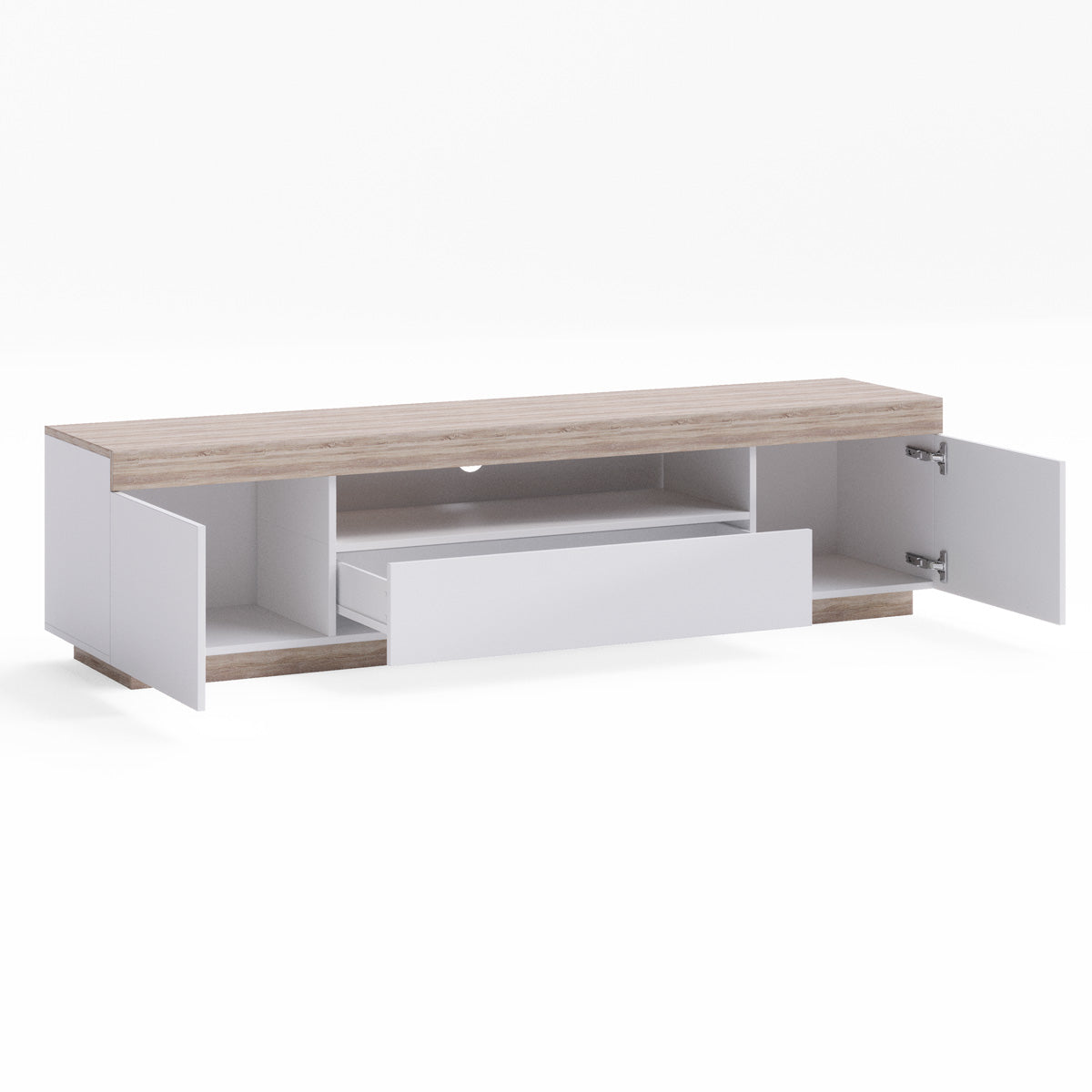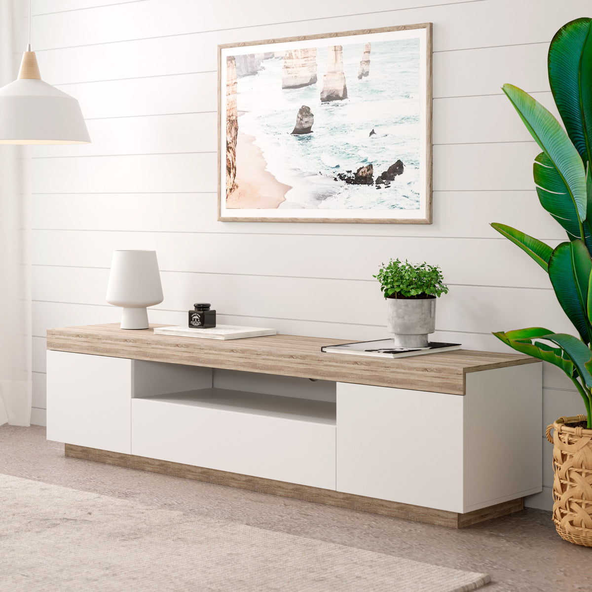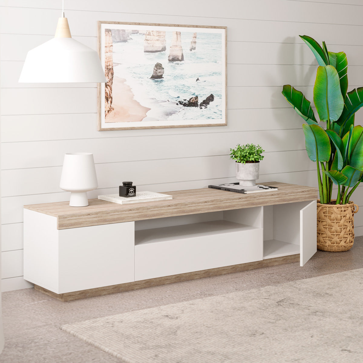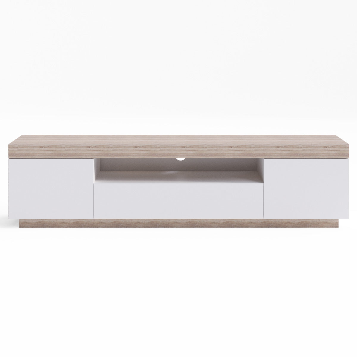 Featuring a beautiful combination of natural oak colour and a crisp white cabinet body, this TV unit brings a coastal charm and timeless elegance to any home interior.