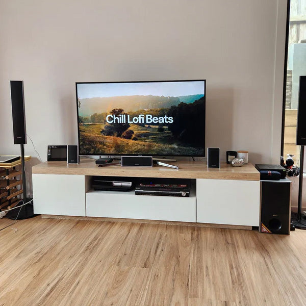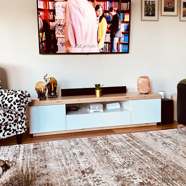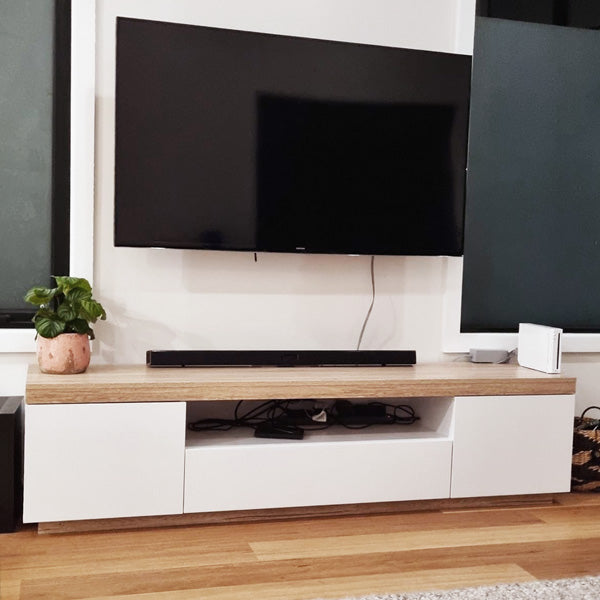 The Bondi 180cm TV unit exudes a contemporary coastal feel with a top oak pattern style board combined with a bright white cabinet body. This 1.8 metre entertainment unit has a practical centre console allowing you to either style it or use as functional storage space. This white tv stand is perfect for a modern Scandinavian styled living room or if you are wanting a beach house vibe room. On either side you will find 2 doors which open to reveal plenty of extra storage. The Bondi TV cabinet has a base which is slightly recessed, which creates for a lovely floating appearance. Our coastal media unit has a sturdy backboard attached with cable hole provided for neat cable management.
