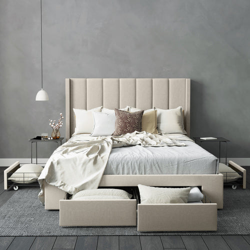 Emilie Winged Storage Bed Frame with Four Extra Large Drawers (Natural Beige Fabric)