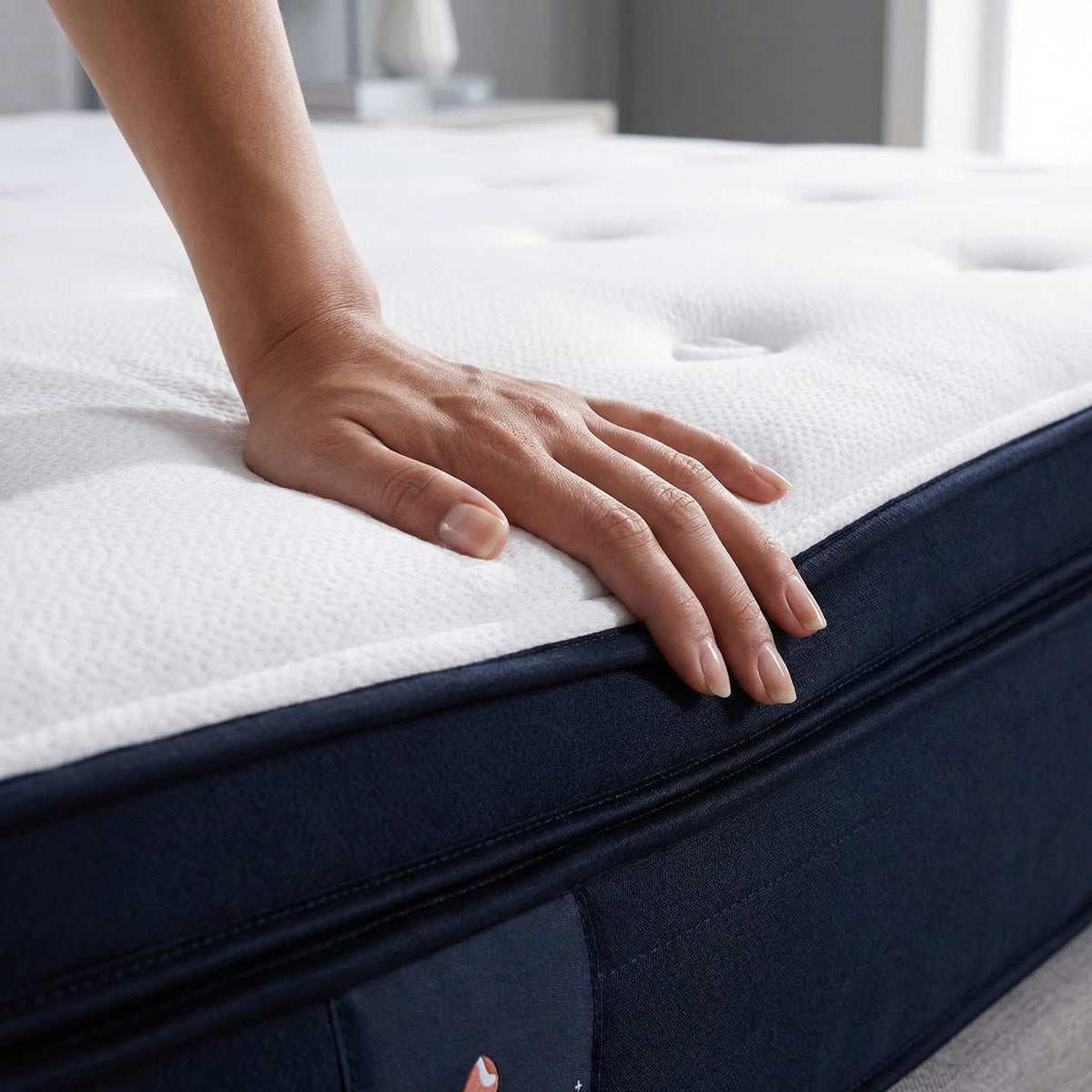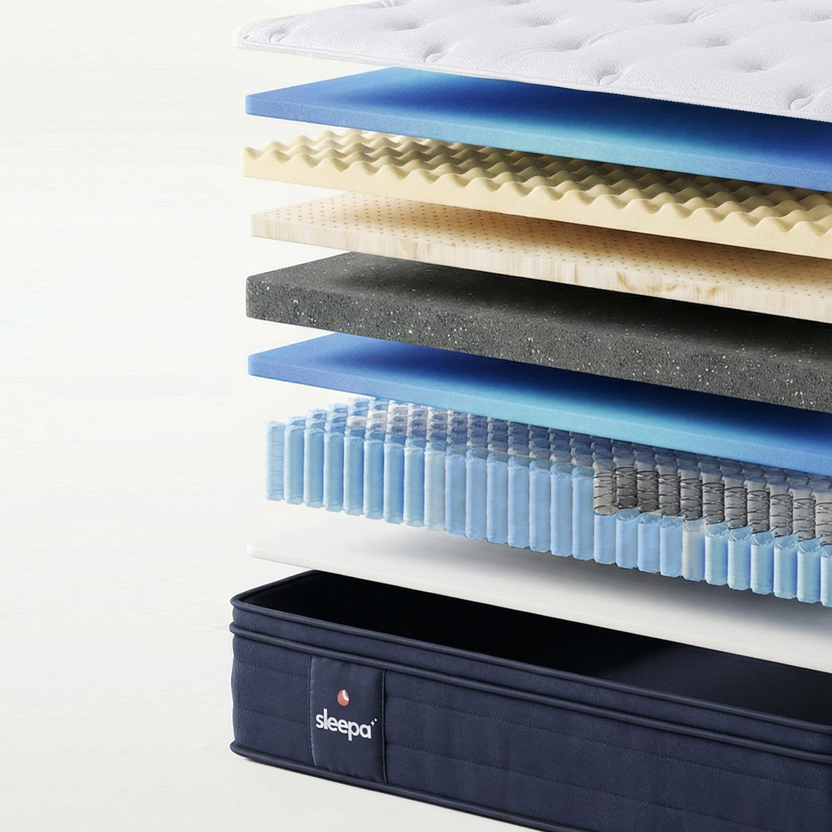 - Bonded padding layers above and below the spring unit for durability and shape retention