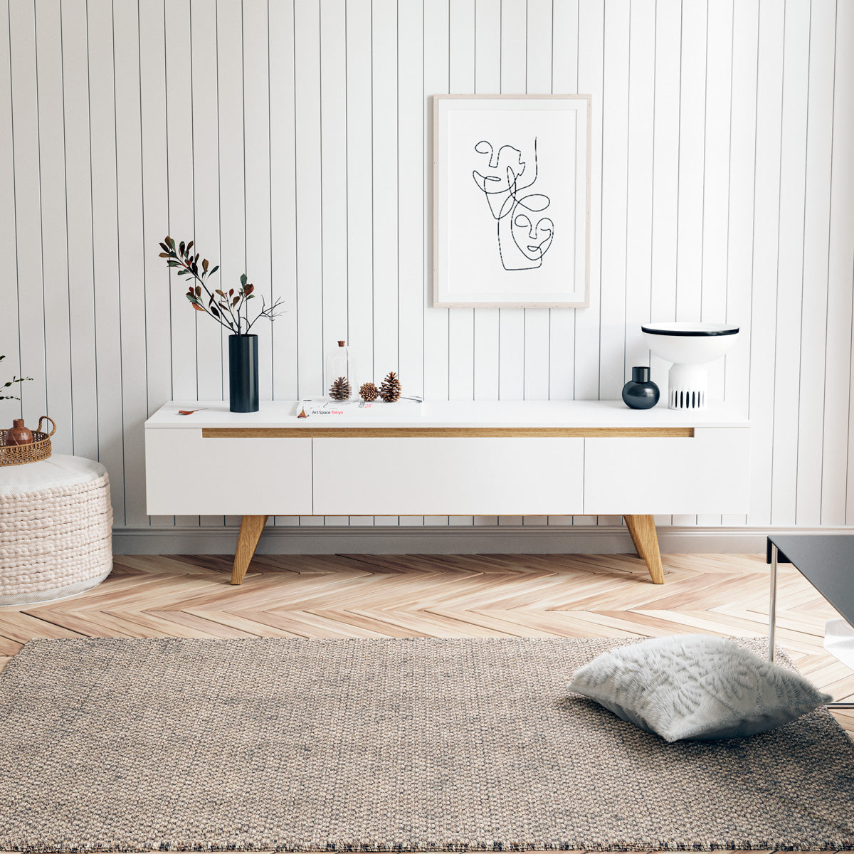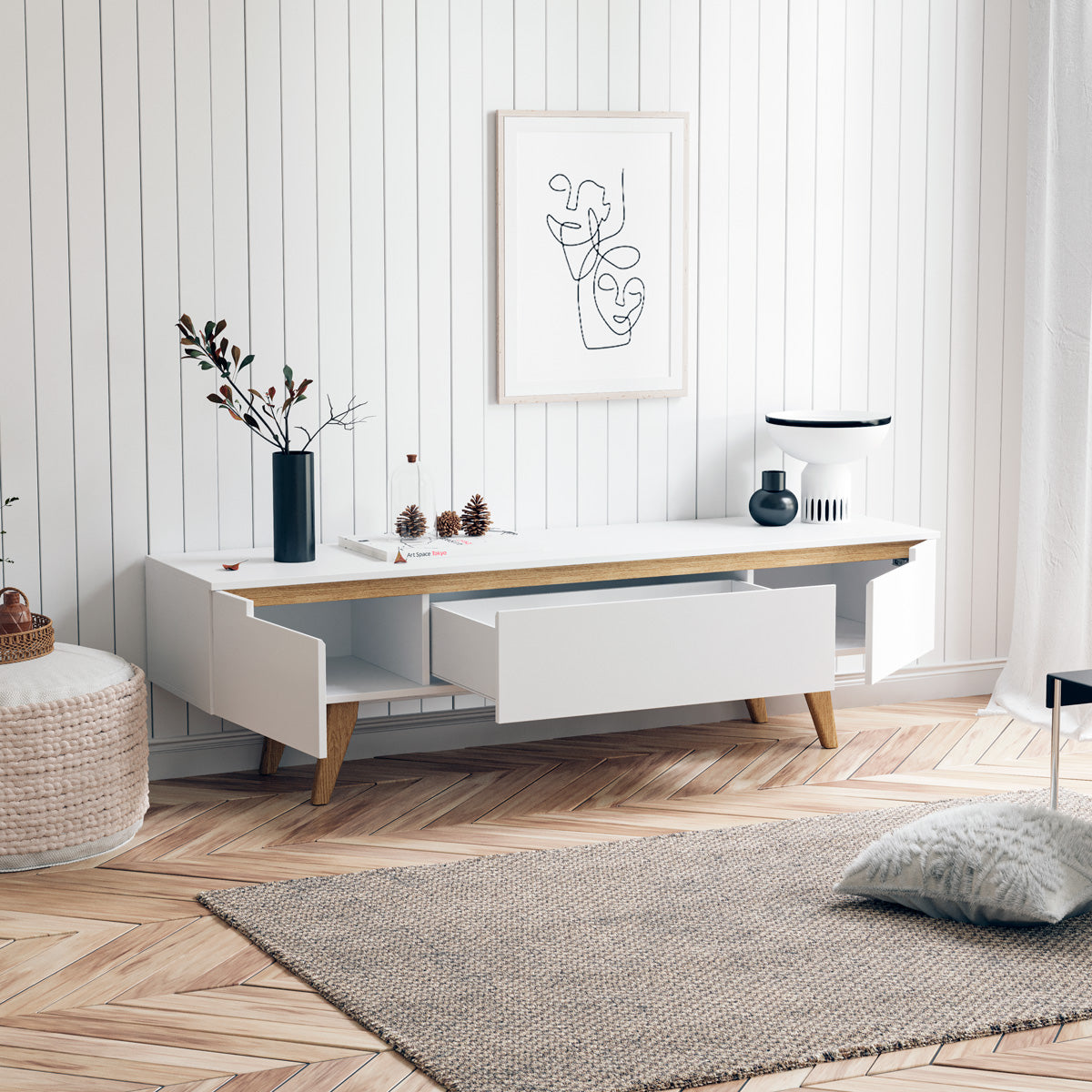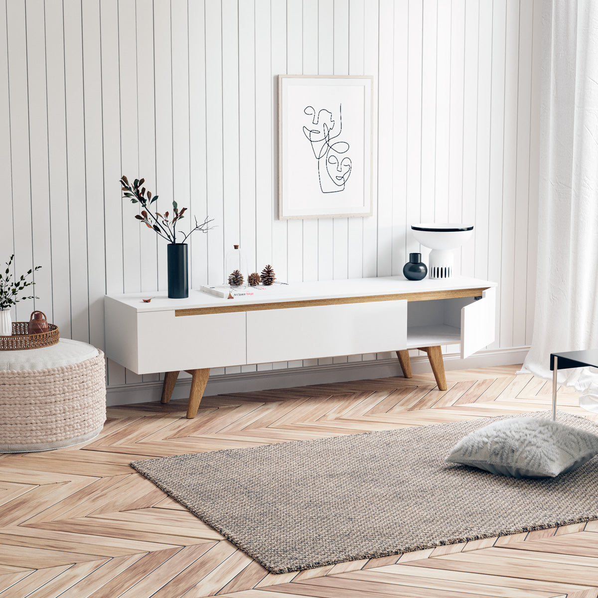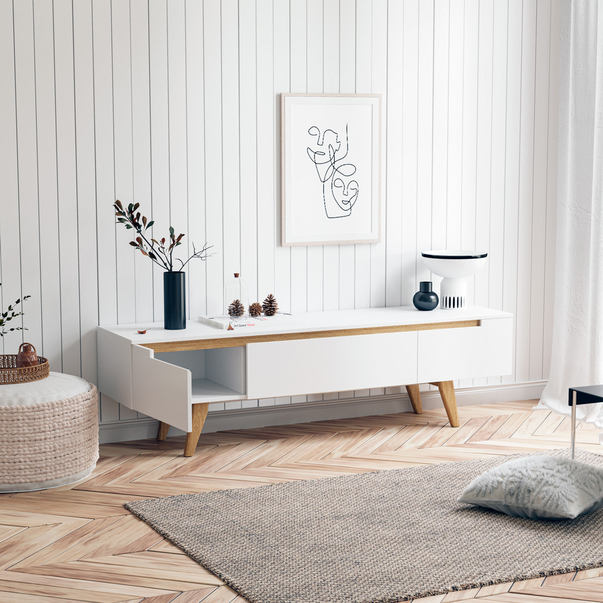 - White TV cabinet with light tone wood colour accents