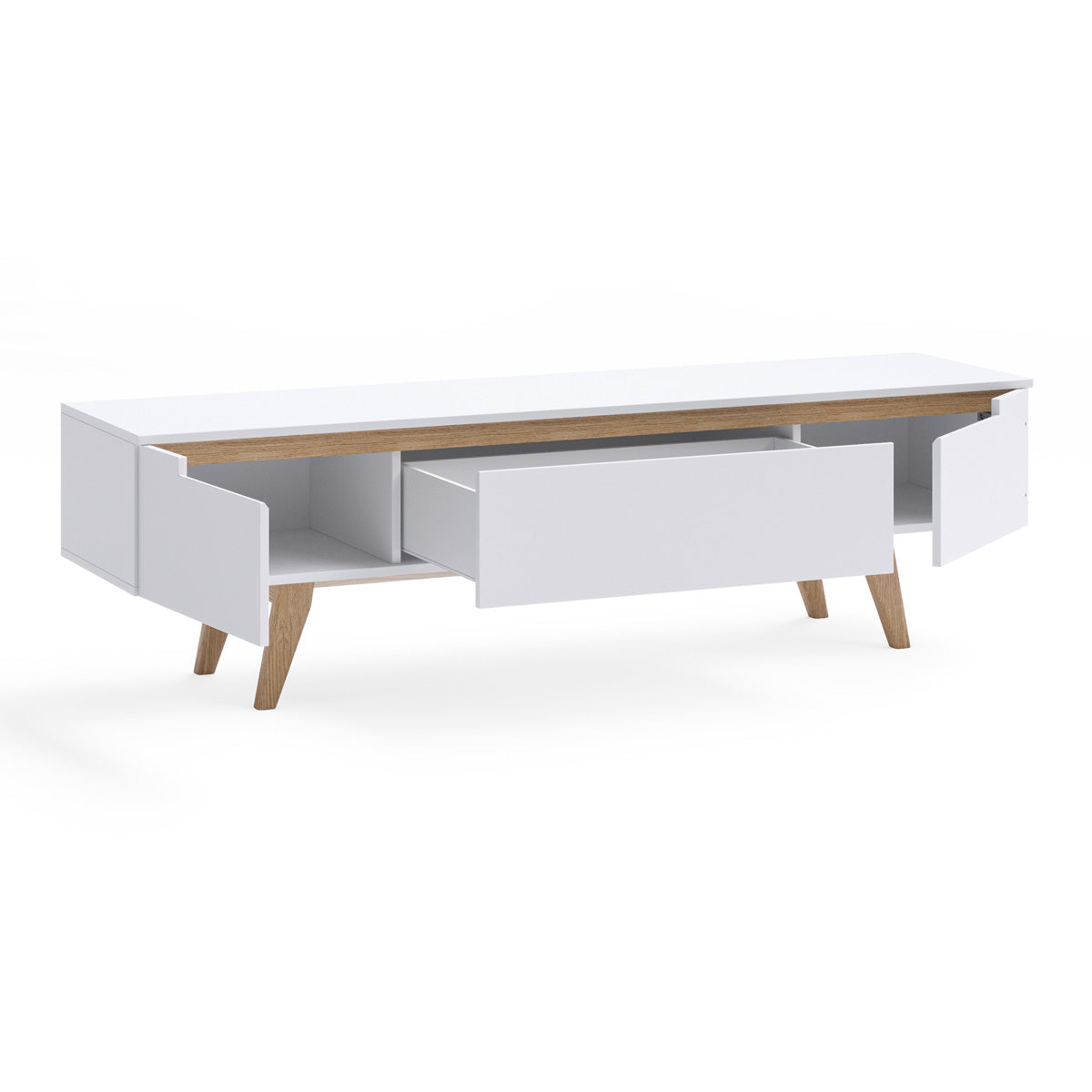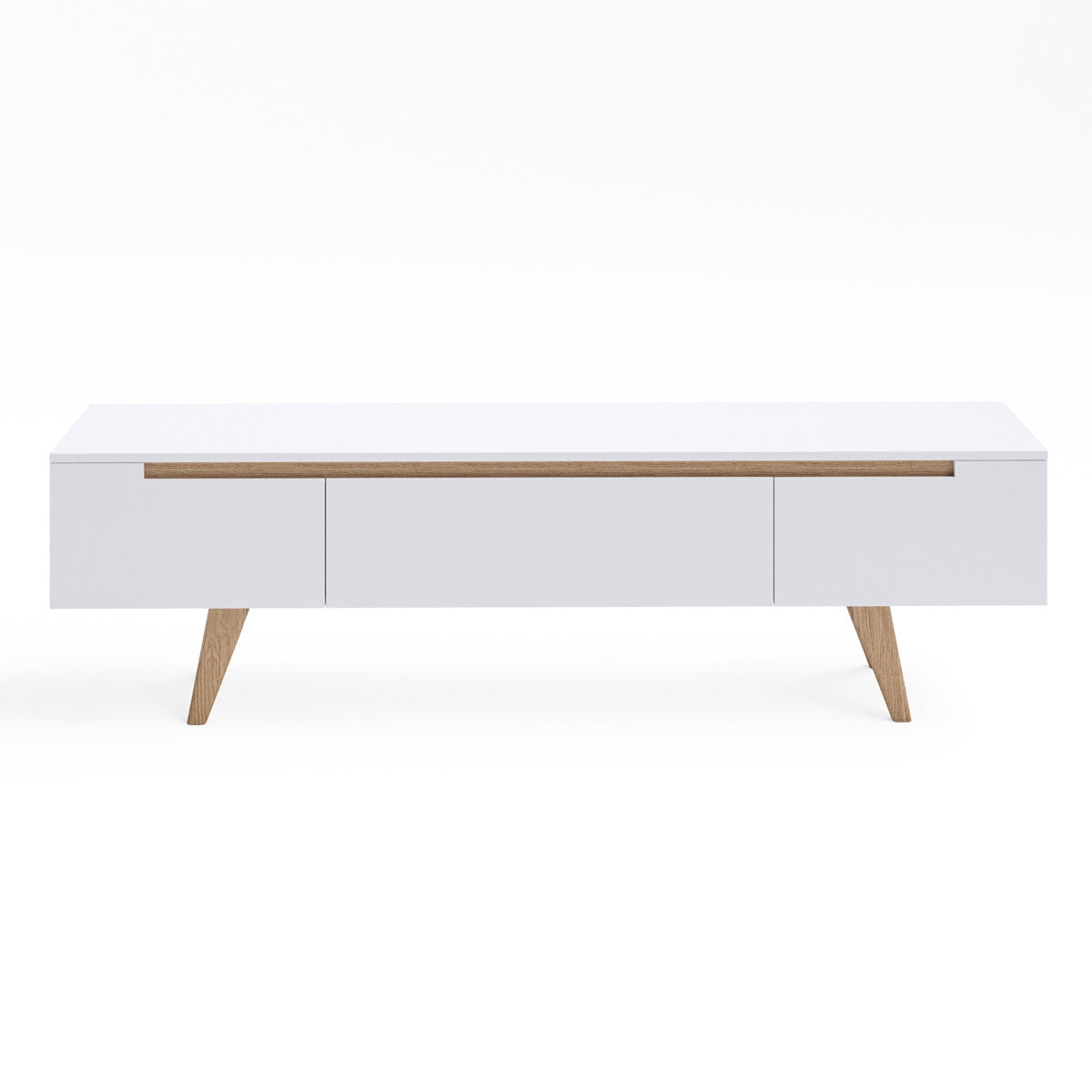 White TV Cabinet Entertainment Unit With Solid Oak Legs (160cm Olsen)